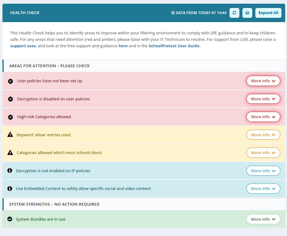 Once you have access and are logged in, please take a look at the reports Dashboard, where you will find interactive live data on filtering within your school and also your school's own Health Check - think of this as your filtering MOT. It shows which areas of your filtering set up need review/action to be compliant with the DfE Standards.
